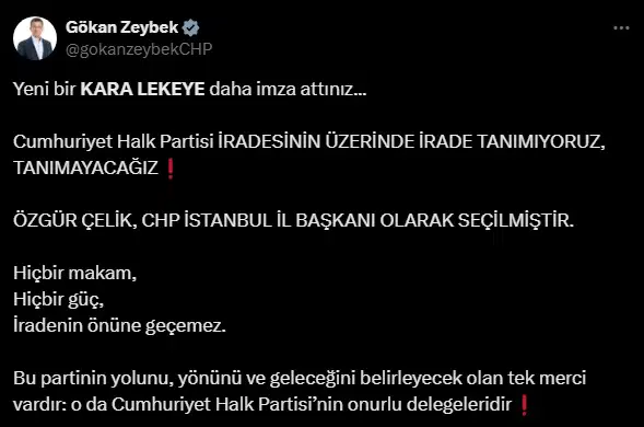 Zeybek, X’ten yaptığı paylaşımda, “Yeni bir KARA LEKEYE daha imza attınız… Cumhuriyet Halk Partisi İRADESİNİN ÜZERİNDE İRADE TANIMIYORUZ, TANIMAYACAĞIZ! ÖZGÜR ÇELİK, CHP İSTANBUL İL BAŞKANI OLARAK SEÇİLMİŞTİR. Hiçbir makam, hiçbir güç, iradenin önüne geçemez. Bu partinin yolunu, yönünü ve geleceğini belirleyecek olan tek merci vardır: o da Cumhuriyet Halk Partisi’nin onurlu delegeleridir” ifadelerini kullandı.
