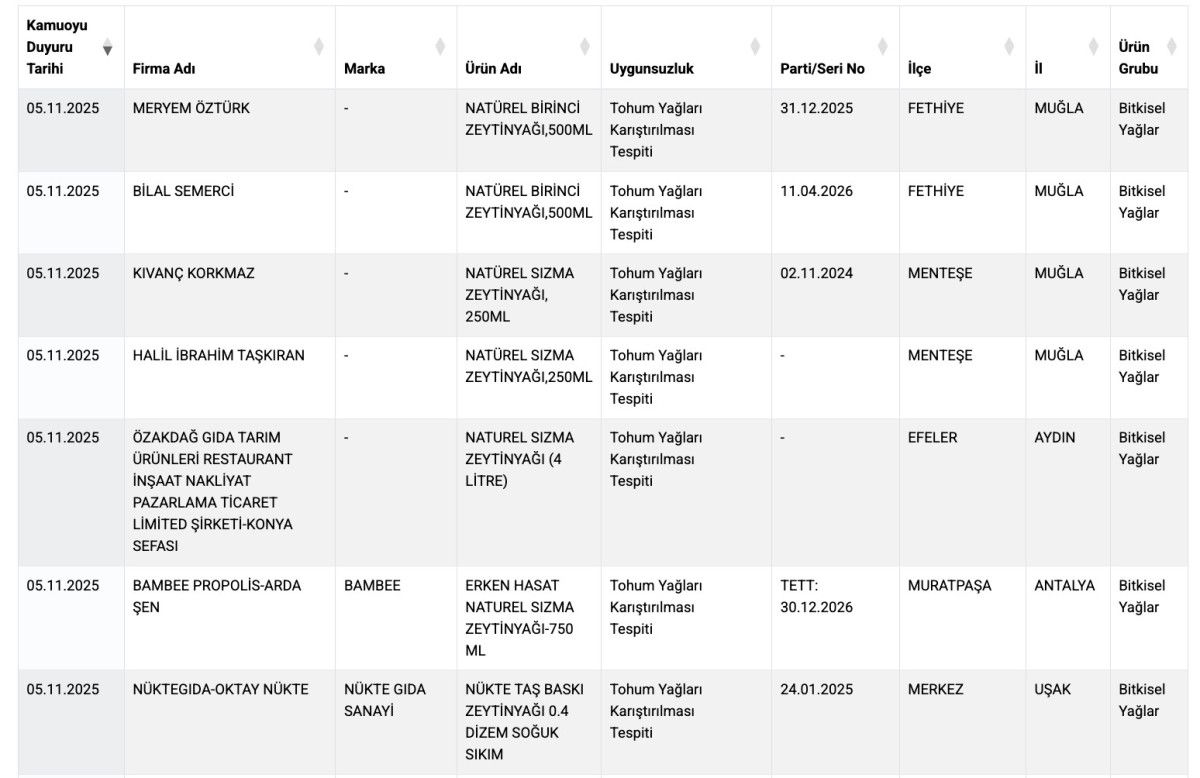 Tarım ve Orman Bakanlığı’nın  gıda ürünlerine yönelik 5 Kasım 2025 tarihli denetimlerde, farklı illerde faaliyet gösteren firmalara ait bitkisel yağ ve süt ürünlerinde çeşitli uygunsuzluklar belirlendi.